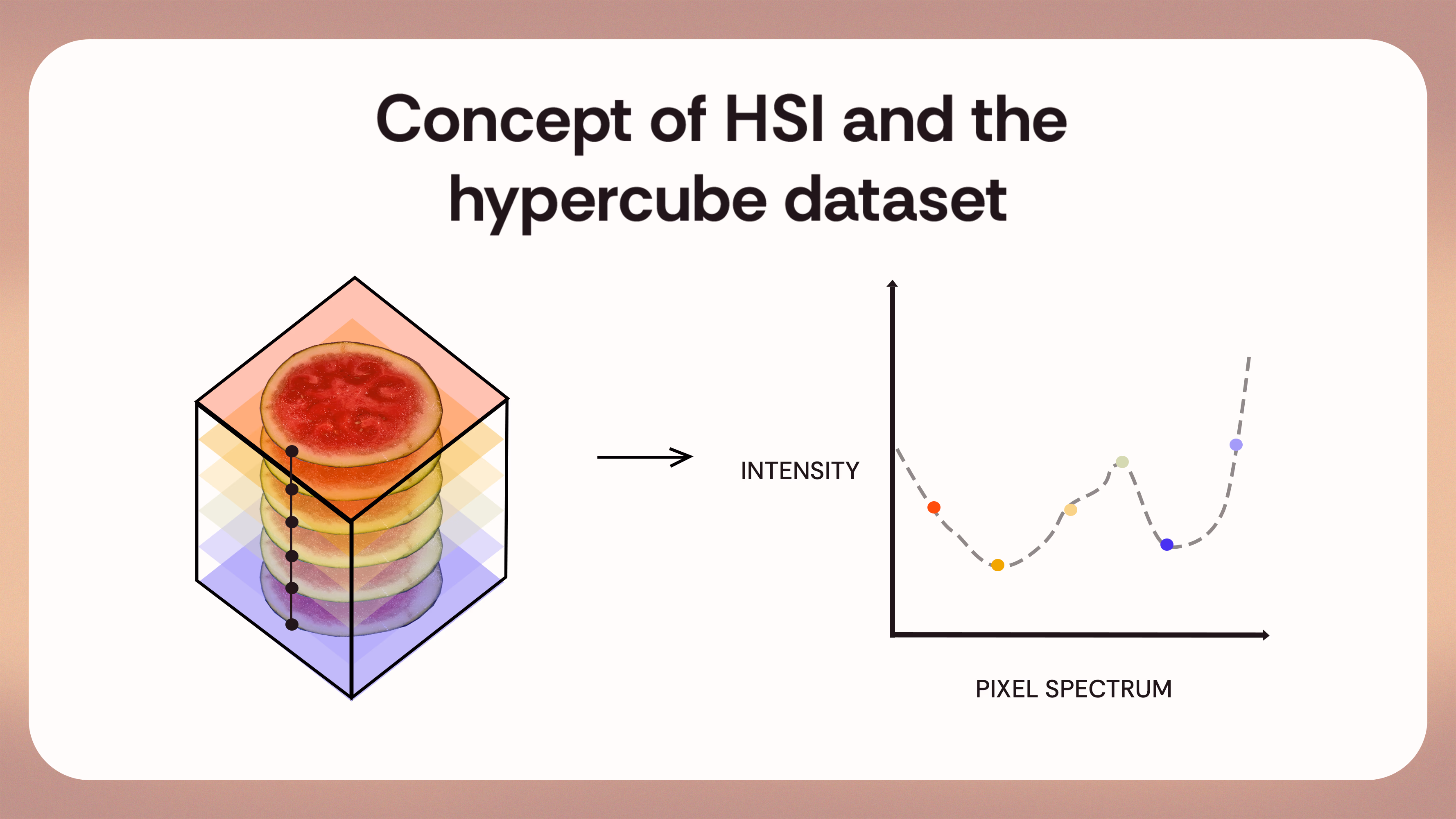 Much like NIR methods, HSI uses non-ionising radiation outside of the visible light spectrum to measure a “spectral fingerprint” from a given sample. The key difference is that HSI uses not one, but typically hundreds of different wavelengths (colors) of light.